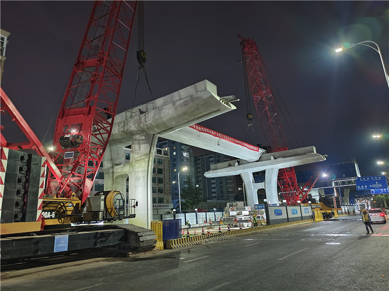 现场采用两台350吨履带吊“双机抬吊”方式架设,于26日晚22:58启动架设,27日凌晨0:16完成首榀箱梁架设,凌晨3:38完成整跨箱梁架设。为确保吊装工作安全有序进行,参建各方高度重视,多次召开箱梁运输吊装专题会,施工前制定了严密的施工方案及应急预案,并通过专家论证。在集团各部门紧密配合下,箱梁架设现场人员分工明确、过程把控到位,确保了箱梁架设工作安全顺利进行。